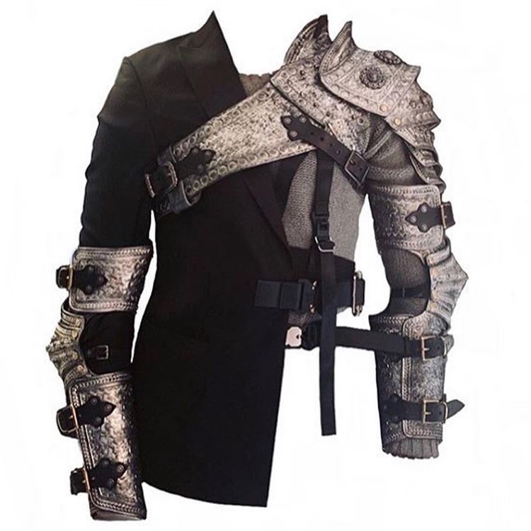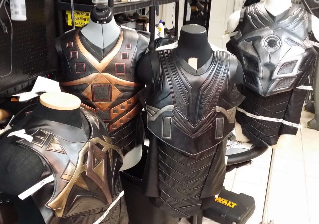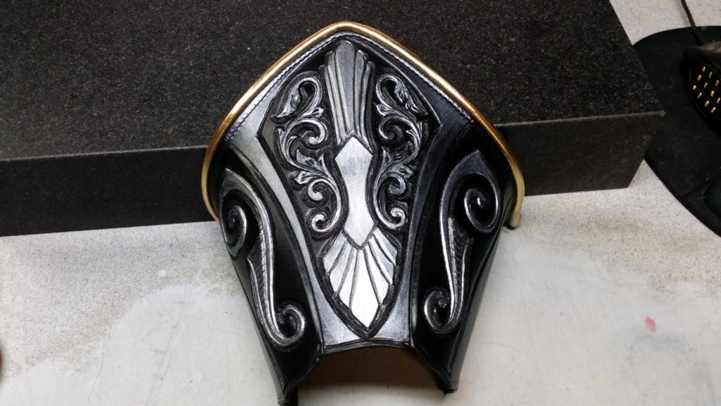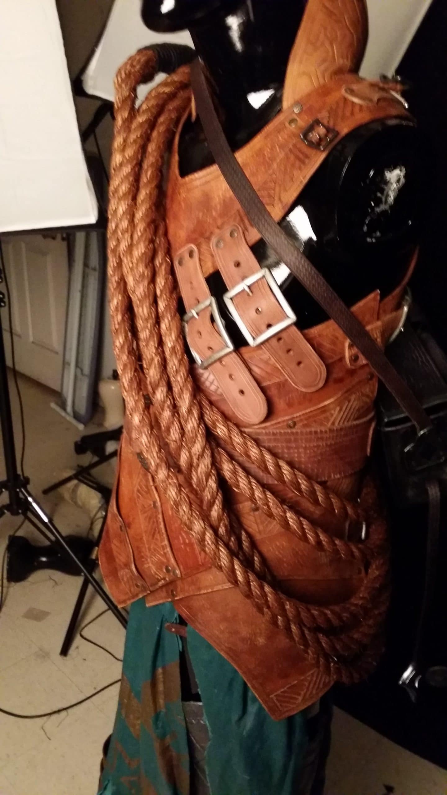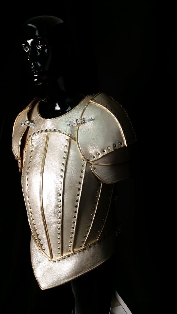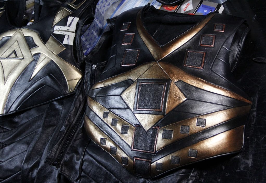 This hero suit was seen all over the world in the Samsung Smart TV ad campaign, even in theaters and super bowl ads at the time. It is an original design by Prince Armory developed based on discussions and feedback from our client. It is entirely leather with metal hardware. The production time on this piece was barely a few weeks.
